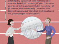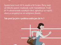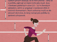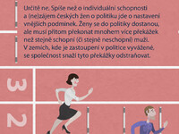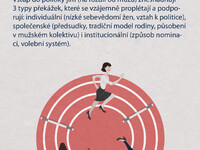 Nízká účast žen v politice není dána jednoduše tím, že ženy do politiky nechtějí nebo pro ni nemají ty správné vlohy. Spíše než o individuální schopnosti a (ne)zájem českých žen o politiku jde o nastavení vnějších podmínek. Ženy se do politiky dostanou, ale musí přitom překonat mnohem více překážek než stejně schopní (či stejně neschopní) muži. Vstup do politiky a působení v ní jim (na rozdíl od mužů) znesnadňují 3 typy překážek, které se vzájemně proplétají a podporují: společenské, individuální a institucionální.